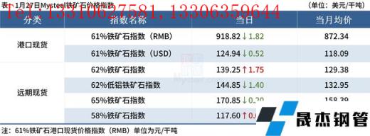 ◎ 1月27日统计新口径114家无缝钢管厂家进口烧结粉总库存3792.52万吨,烧结粉总日耗98.14万吨。原口径64家无缝钢管厂家进口烧结粉总库存1754.93万吨,烧结粉总日耗47.99万吨,库存消费比36.57,烧结矿中平均使用进口矿配比88.07%,无缝钢管厂家不含税平均铁水成本3139元/吨。