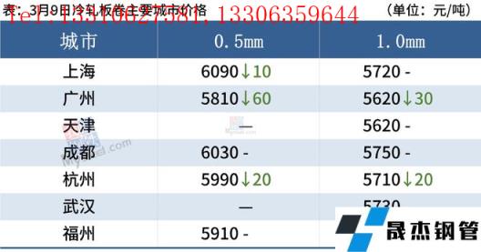 冷轧板卷:3月9日,全国24个主要城市1.0mm冷卷均价5708元/吨,较上个交易日下跌5元/吨。随着黑色系震荡走弱,市场价格步入下行通道,广州、南昌、杭州等地率先下调价格,其余市场则多暗降出货。下游“买涨不买跌”心态明显,多持观望态度,谨慎拿货。综合来看,故预计10日国内冷轧板卷价格或将继续偏弱运行。