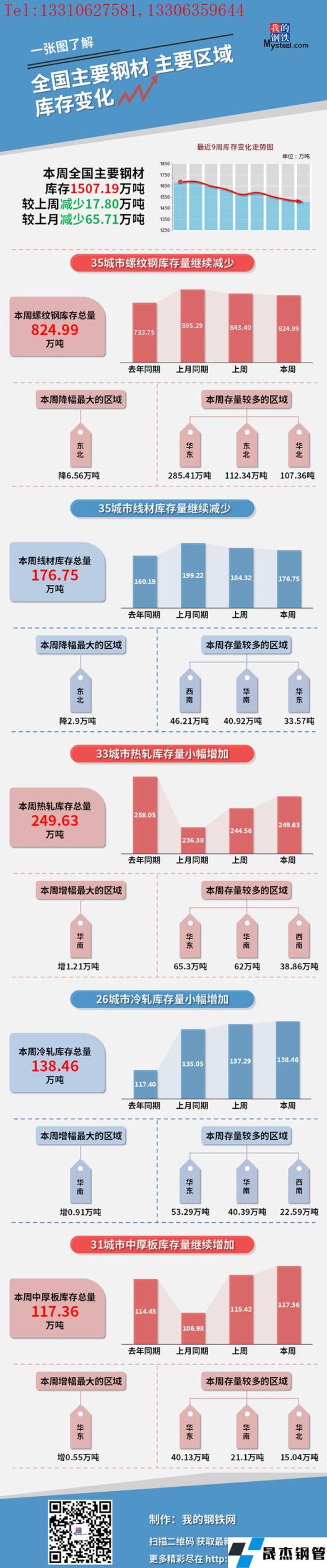 本周,全国主要厚壁无缝钢管社会库存1507.19万吨,较上周减少17.8万吨,较上月减少65.71万吨;螺纹钢库存总量824.99万吨。