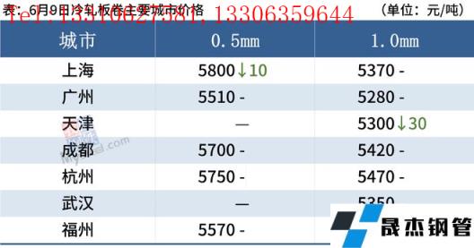 冷轧板卷:6月9日,全国24个主要城市1.0mm冷卷均价5435元/吨,较上个交易日下跌5元/吨。市场需求持续疲软,下游企业按需采购,据悉,目前部分商家低价成交尚可,高价成交艰难,多以出货回笼资金为主。即便黑色系期货盘面震荡偏强运行,但现货市场跟涨动力不足,多数商家为保成交调价意愿并不强,且整体市场成交处于中等偏下水平。库存方面,本周冷轧无缝厚壁钢管厂家库存40.43万吨,周环比减少0.32万吨,社会库存136.09万吨,周环比减少0.02万吨,周消费量84.21万吨,环比增加0.51万吨。综合来看,预计10日国内冷轧板卷价格或将以稳为主。