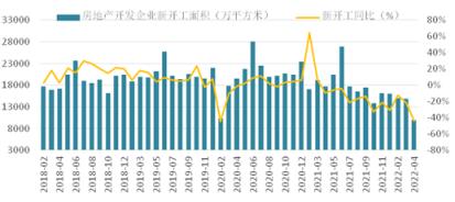 1-4月份,房屋新开工面积39739万平方米,同比下降26.3%;从单月来看,自去年4月份开始,新开工面积持续负增长,今年4月份同比降幅由上月的22.2%扩大至44.2%,新开工下行明显加快,对后期施工和行业的投资形成制约。